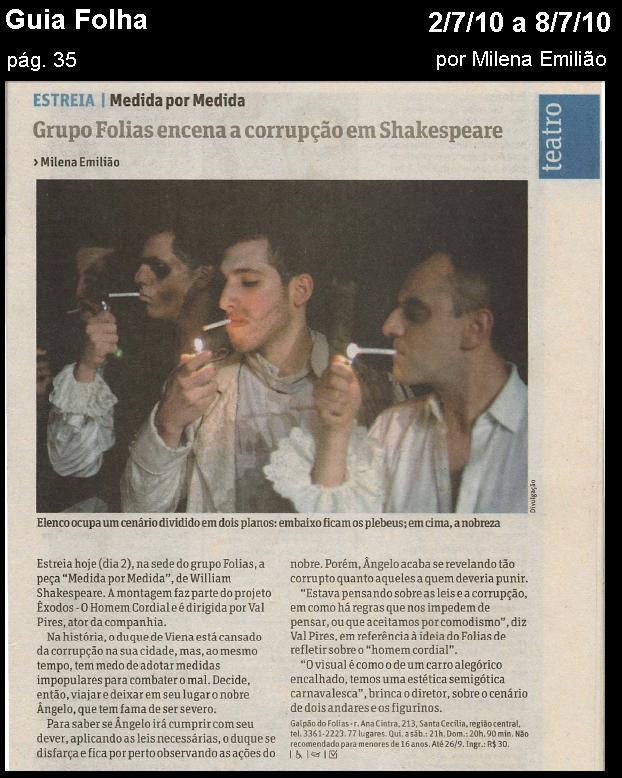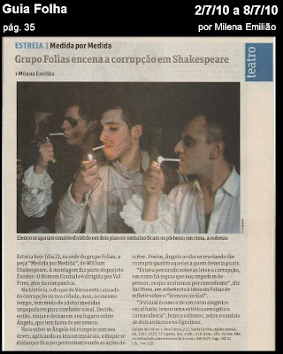 Estreia hoje (dia 2) na sede do Grupo Folias, a peça "Medida por Medida", de William Shakespeare. A montagem faz parte do projeto "Êxodos - O Homem-Cordial" e é dirigida por Val Pires, ator da companhia.